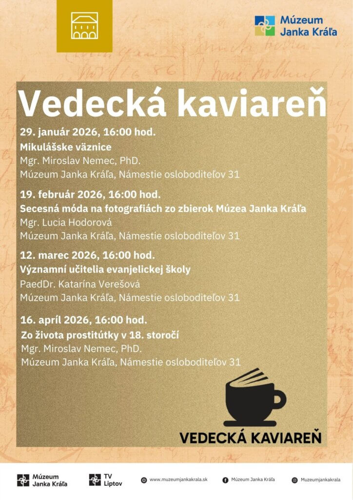 Aj tento rok pokračujeme s populárnym prednáškovým cyklom Vedecká kaviareň. Znovu Vás čaká niekoľko prednášok od historikov z Múzea Janka Kráľa, ale aj pozvaných hostí, na zaujímavé témy. Tešíme sa na stretnutie s Vami.